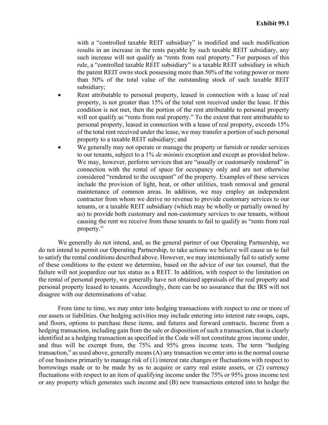 Exhibit 99.1 with a “controlled taxable REIT subsidiary” is modified and such modification results in an increase in the rents payable by such taxable REIT subsidiary, any such increase will not qualify as “rents from real property.” For purposes of this rule, a “controlled taxable REIT subsidiary” is a taxable REIT subsidiary in which the parent REIT owns stock possessing more than 50% of the voting power or more than 50% of the total value of the outstanding stock of such taxable REIT subsidiary; Rent attributable to personal property, leased in connection with a lease of real property, is not greater than 15% of the total rent received under the lease. If this condition is not met, then the portion of the rent attributable to personal property will not qualify as “rents from real property.” To the extent that rent attributable to personal property, leased in connection with a lease of real property, exceeds 15% of the total rent received under the lease, we may transfer a portion of such personal property to a taxable REIT subsidiary; and We generally may not operate or manage the property or furnish or render services to our tenants, subject to a 1% de minimis exception and except as provided below. We may, however, perform services that are “usually or customarily rendered” in connection with the rental of space for occupancy only and are not otherwise considered “rendered to the occupant” of the property. Examples of these services include the provision of light, heat, or other utilities, trash removal and general maintenance of common areas. In addition, we may employ an independent contractor from whom we derive no revenue to provide customary services to our tenants, or a taxable REIT subsidiary (which may be wholly or partially owned by us) to provide both customary and non-customary services to our tenants, without causing the rent we receive from those tenants to fail to qualify as “rents from real property.” We generally do not intend, and, as the general partner of our Operating Partnership, we do not intend to permit our Operating Partnership, to take actions we believe will cause us to fail to satisfy the rental conditions described above. However, we may intentionally fail to satisfy some of these conditions to the extent we determine, based on the advice of our tax counsel, that the failure will not jeopardize our tax status as a REIT. In addition, with respect to the limitation on the rental of personal property, we generally have not obtained appraisals of the real property and personal property leased to tenants. Accordingly, there can be no assurance that the IRS will not disagree with our determinations of value. From time to time, we may enter into hedging transactions with respect to one or more of our assets or liabilities. Our hedging activities may include entering into interest rate swaps, caps, and floors, options to purchase these items, and futures and forward contracts. Income from a hedging transaction, including gain from the sale or disposition of such a transaction, that is clearly identified as a hedging transaction as specified in the Code will not constitute gross income under, and thus will be exempt from, the 75% and 95% gross income tests. The term “hedging transaction,” as used above, generally means (A) any transaction we enter into in the normal course of our business primarily to manage risk of (1) interest rate changes or fluctuations with respect to borrowings made or to be made by us to acquire or carry real estate assets, or (2) currency fluctuations with respect to an item of qualifying income under the 75% or 95% gross income test or any property which generates such income and (B) new transactions entered into to hedge the