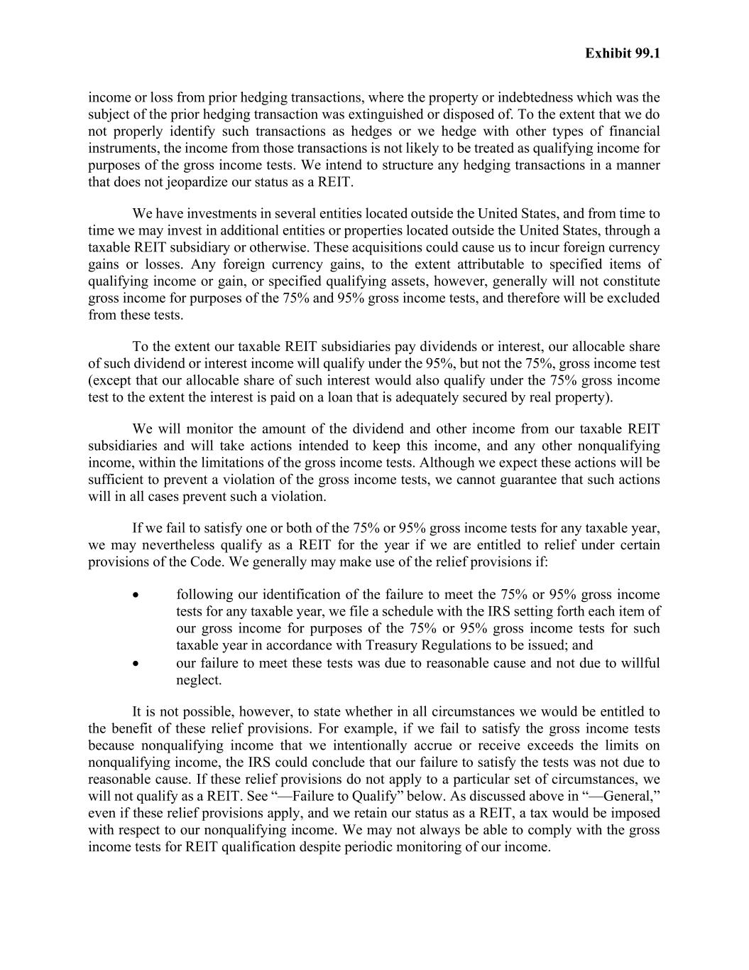 Exhibit 99.1 income or loss from prior hedging transactions, where the property or indebtedness which was the subject of the prior hedging transaction was extinguished or disposed of. To the extent that we do not properly identify such transactions as hedges or we hedge with other types of financial instruments, the income from those transactions is not likely to be treated as qualifying income for purposes of the gross income tests. We intend to structure any hedging transactions in a manner that does not jeopardize our status as a REIT. We have investments in several entities located outside the United States, and from time to time we may invest in additional entities or properties located outside the United States, through a taxable REIT subsidiary or otherwise. These acquisitions could cause us to incur foreign currency gains or losses. Any foreign currency gains, to the extent attributable to specified items of qualifying income or gain, or specified qualifying assets, however, generally will not constitute gross income for purposes of the 75% and 95% gross income tests, and therefore will be excluded from these tests. To the extent our taxable REIT subsidiaries pay dividends or interest, our allocable share of such dividend or interest income will qualify under the 95%, but not the 75%, gross income test (except that our allocable share of such interest would also qualify under the 75% gross income test to the extent the interest is paid on a loan that is adequately secured by real property). We will monitor the amount of the dividend and other income from our taxable REIT subsidiaries and will take actions intended to keep this income, and any other nonqualifying income, within the limitations of the gross income tests. Although we expect these actions will be sufficient to prevent a violation of the gross income tests, we cannot guarantee that such actions will in all cases prevent such a violation. If we fail to satisfy one or both of the 75% or 95% gross income tests for any taxable year, we may nevertheless qualify as a REIT for the year if we are entitled to relief under certain provisions of the Code. We generally may make use of the relief provisions if: following our identification of the failure to meet the 75% or 95% gross income tests for any taxable year, we file a schedule with the IRS setting forth each item of our gross income for purposes of the 75% or 95% gross income tests for such taxable year in accordance with Treasury Regulations to be issued; and our failure to meet these tests was due to reasonable cause and not due to willful neglect. It is not possible, however, to state whether in all circumstances we would be entitled to the benefit of these relief provisions. For example, if we fail to satisfy the gross income tests because nonqualifying income that we intentionally accrue or receive exceeds the limits on nonqualifying income, the IRS could conclude that our failure to satisfy the tests was not due to reasonable cause. If these relief provisions do not apply to a particular set of circumstances, we will not qualify as a REIT. See “—Failure to Qualify” below. As discussed above in “—General,” even if these relief provisions apply, and we retain our status as a REIT, a tax would be imposed with respect to our nonqualifying income. We may not always be able to comply with the gross income tests for REIT qualification despite periodic monitoring of our income.