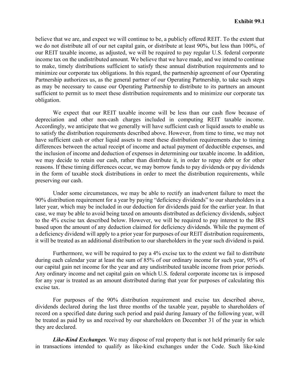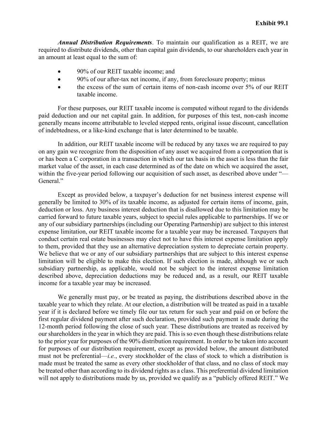 Exhibit 99.1 Annual Distribution Requirements. To maintain our qualification as a REIT, we are required to distribute dividends, other than capital gain dividends, to our shareholders each year in an amount at least equal to the sum of: 90% of our REIT taxable income; and 90% of our after-tax net income, if any, from foreclosure property; minus the excess of the sum of certain items of non-cash income over 5% of our REIT taxable income. For these purposes, our REIT taxable income is computed without regard to the dividends paid deduction and our net capital gain. In addition, for purposes of this test, non-cash income generally means income attributable to leveled stepped rents, original issue discount, cancellation of indebtedness, or a like-kind exchange that is later determined to be taxable. In addition, our REIT taxable income will be reduced by any taxes we are required to pay on any gain we recognize from the disposition of any asset we acquired from a corporation that is or has been a C corporation in a transaction in which our tax basis in the asset is less than the fair market value of the asset, in each case determined as of the date on which we acquired the asset, within the five-year period following our acquisition of such asset, as described above under “— General.” Except as provided below, a taxpayer’s deduction for net business interest expense will generally be limited to 30% of its taxable income, as adjusted for certain items of income, gain, deduction or loss. Any business interest deduction that is disallowed due to this limitation may be carried forward to future taxable years, subject to special rules applicable to partnerships. If we or any of our subsidiary partnerships (including our Operating Partnership) are subject to this interest expense limitation, our REIT taxable income for a taxable year may be increased. Taxpayers that conduct certain real estate businesses may elect not to have this interest expense limitation apply to them, provided that they use an alternative depreciation system to depreciate certain property. We believe that we or any of our subsidiary partnerships that are subject to this interest expense limitation will be eligible to make this election. If such election is made, although we or such subsidiary partnership, as applicable, would not be subject to the interest expense limitation described above, depreciation deductions may be reduced and, as a result, our REIT taxable income for a taxable year may be increased. We generally must pay, or be treated as paying, the distributions described above in the taxable year to which they relate. At our election, a distribution will be treated as paid in a taxable year if it is declared before we timely file our tax return for such year and paid on or before the first regular dividend payment after such declaration, provided such payment is made during the 12-month period following the close of such year. These distributions are treated as received by our shareholders in the year in which they are paid. This is so even though these distributions relate to the prior year for purposes of the 90% distribution requirement. In order to be taken into account for purposes of our distribution requirement, except as provided below, the amount distributed must not be preferential—i.e., every stockholder of the class of stock to which a distribution is made must be treated the same as every other stockholder of that class, and no class of stock may be treated other than according to its dividend rights as a class. This preferential dividend limitation will not apply to distributions made by us, provided we qualify as a “publicly offered REIT.” We