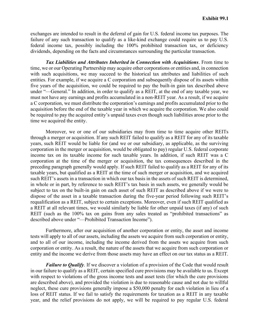 Exhibit 99.1 exchanges are intended to result in the deferral of gain for U.S. federal income tax purposes. The failure of any such transaction to qualify as a like-kind exchange could require us to pay U.S. federal income tax, possibly including the 100% prohibited transaction tax, or deficiency dividends, depending on the facts and circumstances surrounding the particular transaction. Tax Liabilities and Attributes Inherited in Connection with Acquisitions. From time to time, we or our Operating Partnership may acquire other corporations or entities and, in connection with such acquisitions, we may succeed to the historical tax attributes and liabilities of such entities. For example, if we acquire a C corporation and subsequently dispose of its assets within five years of the acquisition, we could be required to pay the built-in gain tax described above under “—General.” In addition, in order to qualify as a REIT, at the end of any taxable year, we must not have any earnings and profits accumulated in a non-REIT year. As a result, if we acquire a C corporation, we must distribute the corporation’s earnings and profits accumulated prior to the acquisition before the end of the taxable year in which we acquire the corporation. We also could be required to pay the acquired entity’s unpaid taxes even though such liabilities arose prior to the time we acquired the entity. Moreover, we or one of our subsidiaries may from time to time acquire other REITs through a merger or acquisition. If any such REIT failed to qualify as a REIT for any of its taxable years, such REIT would be liable for (and we or our subsidiary, as applicable, as the surviving corporation in the merger or acquisition, would be obligated to pay) regular U.S. federal corporate income tax on its taxable income for such taxable years. In addition, if such REIT was a C corporation at the time of the merger or acquisition, the tax consequences described in the preceding paragraph generally would apply. If such REIT failed to qualify as a REIT for any of its taxable years, but qualified as a REIT at the time of such merger or acquisition, and we acquired such REIT’s assets in a transaction in which our tax basis in the assets of such REIT is determined, in whole or in part, by reference to such REIT’s tax basis in such assets, we generally would be subject to tax on the built-in gain on each asset of such REIT as described above if we were to dispose of the asset in a taxable transaction during the five-year period following such REIT’s requalification as a REIT, subject to certain exceptions. Moreover, even if such REIT qualified as a REIT at all relevant times, we would similarly be liable for other unpaid taxes (if any) of such REIT (such as the 100% tax on gains from any sales treated as “prohibited transactions” as described above under “—Prohibited Transaction Income”). Furthermore, after our acquisition of another corporation or entity, the asset and income tests will apply to all of our assets, including the assets we acquire from such corporation or entity, and to all of our income, including the income derived from the assets we acquire from such corporation or entity. As a result, the nature of the assets that we acquire from such corporation or entity and the income we derive from those assets may have an effect on our tax status as a REIT. Failure to Qualify. If we discover a violation of a provision of the Code that would result in our failure to qualify as a REIT, certain specified cure provisions may be available to us. Except with respect to violations of the gross income tests and asset tests (for which the cure provisions are described above), and provided the violation is due to reasonable cause and not due to willful neglect, these cure provisions generally impose a $50,000 penalty for each violation in lieu of a loss of REIT status. If we fail to satisfy the requirements for taxation as a REIT in any taxable year, and the relief provisions do not apply, we will be required to pay regular U.S. federal