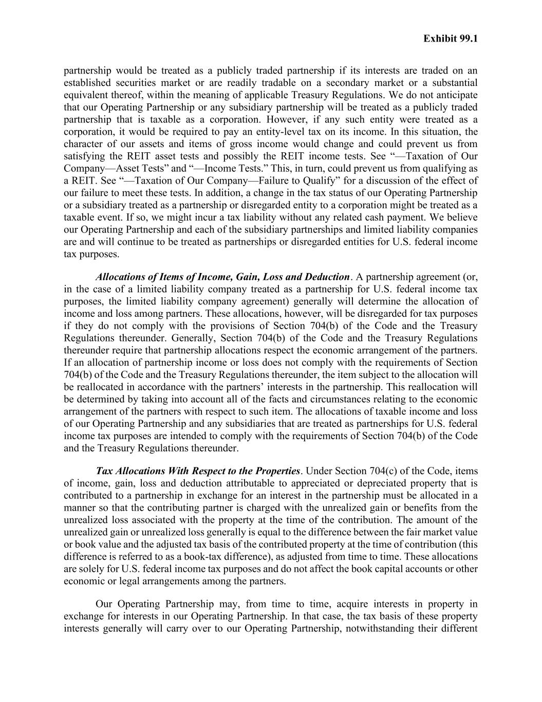 Exhibit 99.1 partnership would be treated as a publicly traded partnership if its interests are traded on an established securities market or are readily tradable on a secondary market or a substantial equivalent thereof, within the meaning of applicable Treasury Regulations. We do not anticipate that our Operating Partnership or any subsidiary partnership will be treated as a publicly traded partnership that is taxable as a corporation. However, if any such entity were treated as a corporation, it would be required to pay an entity-level tax on its income. In this situation, the character of our assets and items of gross income would change and could prevent us from satisfying the REIT asset tests and possibly the REIT income tests. See “—Taxation of Our Company—Asset Tests” and “—Income Tests.” This, in turn, could prevent us from qualifying as a REIT. See “—Taxation of Our Company—Failure to Qualify” for a discussion of the effect of our failure to meet these tests. In addition, a change in the tax status of our Operating Partnership or a subsidiary treated as a partnership or disregarded entity to a corporation might be treated as a taxable event. If so, we might incur a tax liability without any related cash payment. We believe our Operating Partnership and each of the subsidiary partnerships and limited liability companies are and will continue to be treated as partnerships or disregarded entities for U.S. federal income tax purposes. Allocations of Items of Income, Gain, Loss and Deduction. A partnership agreement (or, in the case of a limited liability company treated as a partnership for U.S. federal income tax purposes, the limited liability company agreement) generally will determine the allocation of income and loss among partners. These allocations, however, will be disregarded for tax purposes if they do not comply with the provisions of Section 704(b) of the Code and the Treasury Regulations thereunder. Generally, Section 704(b) of the Code and the Treasury Regulations thereunder require that partnership allocations respect the economic arrangement of the partners. If an allocation of partnership income or loss does not comply with the requirements of Section 704(b) of the Code and the Treasury Regulations thereunder, the item subject to the allocation will be reallocated in accordance with the partners’ interests in the partnership. This reallocation will be determined by taking into account all of the facts and circumstances relating to the economic arrangement of the partners with respect to such item. The allocations of taxable income and loss of our Operating Partnership and any subsidiaries that are treated as partnerships for U.S. federal income tax purposes are intended to comply with the requirements of Section 704(b) of the Code and the Treasury Regulations thereunder. Tax Allocations With Respect to the Properties. Under Section 704(c) of the Code, items of income, gain, loss and deduction attributable to appreciated or depreciated property that is contributed to a partnership in exchange for an interest in the partnership must be allocated in a manner so that the contributing partner is charged with the unrealized gain or benefits from the unrealized loss associated with the property at the time of the contribution. The amount of the unrealized gain or unrealized loss generally is equal to the difference between the fair market value or book value and the adjusted tax basis of the contributed property at the time of contribution (this difference is referred to as a book-tax difference), as adjusted from time to time. These allocations are solely for U.S. federal income tax purposes and do not affect the book capital accounts or other economic or legal arrangements among the partners. Our Operating Partnership may, from time to time, acquire interests in property in exchange for interests in our Operating Partnership. In that case, the tax basis of these property interests generally will carry over to our Operating Partnership, notwithstanding their different