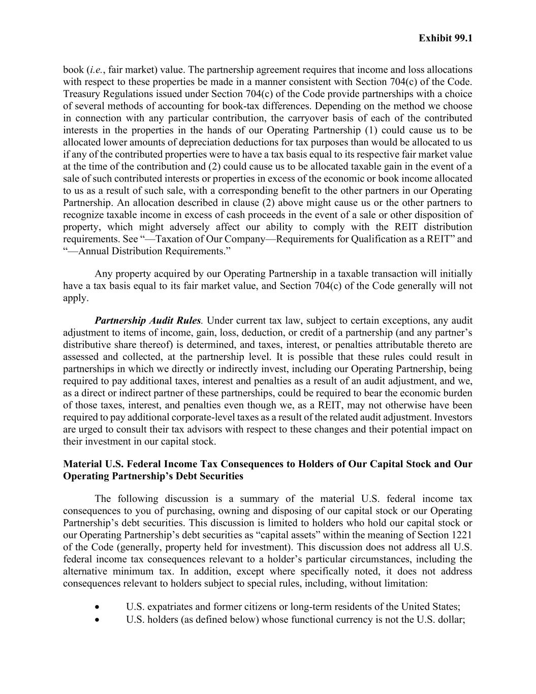 Exhibit 99.1 book (i.e., fair market) value. The partnership agreement requires that income and loss allocations with respect to these properties be made in a manner consistent with Section 704(c) of the Code. Treasury Regulations issued under Section 704(c) of the Code provide partnerships with a choice of several methods of accounting for book-tax differences. Depending on the method we choose in connection with any particular contribution, the carryover basis of each of the contributed interests in the properties in the hands of our Operating Partnership (1) could cause us to be allocated lower amounts of depreciation deductions for tax purposes than would be allocated to us if any of the contributed properties were to have a tax basis equal to its respective fair market value at the time of the contribution and (2) could cause us to be allocated taxable gain in the event of a sale of such contributed interests or properties in excess of the economic or book income allocated to us as a result of such sale, with a corresponding benefit to the other partners in our Operating Partnership. An allocation described in clause (2) above might cause us or the other partners to recognize taxable income in excess of cash proceeds in the event of a sale or other disposition of property, which might adversely affect our ability to comply with the REIT distribution requirements. See “—Taxation of Our Company—Requirements for Qualification as a REIT” and “—Annual Distribution Requirements.” Any property acquired by our Operating Partnership in a taxable transaction will initially have a tax basis equal to its fair market value, and Section 704(c) of the Code generally will not apply. Partnership Audit Rules. Under current tax law, subject to certain exceptions, any audit adjustment to items of income, gain, loss, deduction, or credit of a partnership (and any partner’s distributive share thereof) is determined, and taxes, interest, or penalties attributable thereto are assessed and collected, at the partnership level. It is possible that these rules could result in partnerships in which we directly or indirectly invest, including our Operating Partnership, being required to pay additional taxes, interest and penalties as a result of an audit adjustment, and we, as a direct or indirect partner of these partnerships, could be required to bear the economic burden of those taxes, interest, and penalties even though we, as a REIT, may not otherwise have been required to pay additional corporate-level taxes as a result of the related audit adjustment. Investors are urged to consult their tax advisors with respect to these changes and their potential impact on their investment in our capital stock. Material U.S. Federal Income Tax Consequences to Holders of Our Capital Stock and Our Operating Partnership’s Debt Securities The following discussion is a summary of the material U.S. federal income tax consequences to you of purchasing, owning and disposing of our capital stock or our Operating Partnership’s debt securities. This discussion is limited to holders who hold our capital stock or our Operating Partnership’s debt securities as “capital assets” within the meaning of Section 1221 of the Code (generally, property held for investment). This discussion does not address all U.S. federal income tax consequences relevant to a holder’s particular circumstances, including the alternative minimum tax. In addition, except where specifically noted, it does not address consequences relevant to holders subject to special rules, including, without limitation: U.S. expatriates and former citizens or long-term residents of the United States; U.S. holders (as defined below) whose functional currency is not the U.S. dollar;