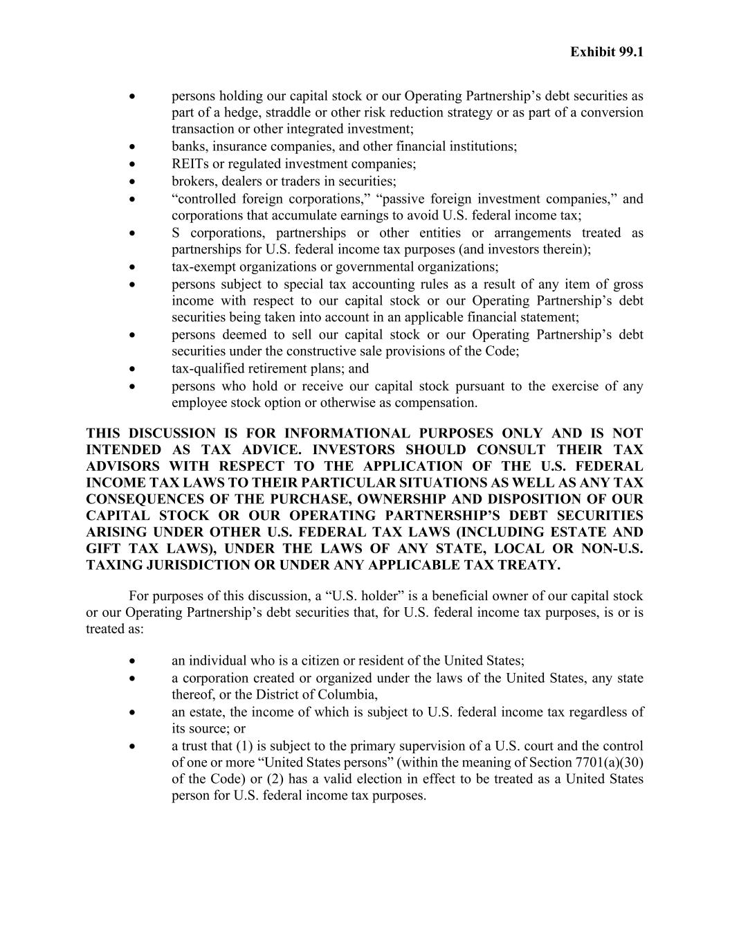 Exhibit 99.1 persons holding our capital stock or our Operating Partnership’s debt securities as part of a hedge, straddle or other risk reduction strategy or as part of a conversion transaction or other integrated investment; banks, insurance companies, and other financial institutions; REITs or regulated investment companies; brokers, dealers or traders in securities; “controlled foreign corporations,” “passive foreign investment companies,” and corporations that accumulate earnings to avoid U.S. federal income tax; S corporations, partnerships or other entities or arrangements treated as partnerships for U.S. federal income tax purposes (and investors therein); tax-exempt organizations or governmental organizations; persons subject to special tax accounting rules as a result of any item of gross income with respect to our capital stock or our Operating Partnership’s debt securities being taken into account in an applicable financial statement; persons deemed to sell our capital stock or our Operating Partnership’s debt securities under the constructive sale provisions of the Code; tax-qualified retirement plans; and persons who hold or receive our capital stock pursuant to the exercise of any employee stock option or otherwise as compensation. THIS DISCUSSION IS FOR INFORMATIONAL PURPOSES ONLY AND IS NOT INTENDED AS TAX ADVICE. INVESTORS SHOULD CONSULT THEIR TAX ADVISORS WITH RESPECT TO THE APPLICATION OF THE U.S. FEDERAL INCOME TAX LAWS TO THEIR PARTICULAR SITUATIONS AS WELL AS ANY TAX CONSEQUENCES OF THE PURCHASE, OWNERSHIP AND DISPOSITION OF OUR CAPITAL STOCK OR OUR OPERATING PARTNERSHIP’S DEBT SECURITIES ARISING UNDER OTHER U.S. FEDERAL TAX LAWS (INCLUDING ESTATE AND GIFT TAX LAWS), UNDER THE LAWS OF ANY STATE, LOCAL OR NON-U.S. TAXING JURISDICTION OR UNDER ANY APPLICABLE TAX TREATY. For purposes of this discussion, a “U.S. holder” is a beneficial owner of our capital stock or our Operating Partnership’s debt securities that, for U.S. federal income tax purposes, is or is treated as: an individual who is a citizen or resident of the United States; a corporation created or organized under the laws of the United States, any state thereof, or the District of Columbia, an estate, the income of which is subject to U.S. federal income tax regardless of its source; or a trust that (1) is subject to the primary supervision of a U.S. court and the control of one or more “United States persons” (within the meaning of Section 7701(a)(30) of the Code) or (2) has a valid election in effect to be treated as a United States person for U.S. federal income tax purposes.