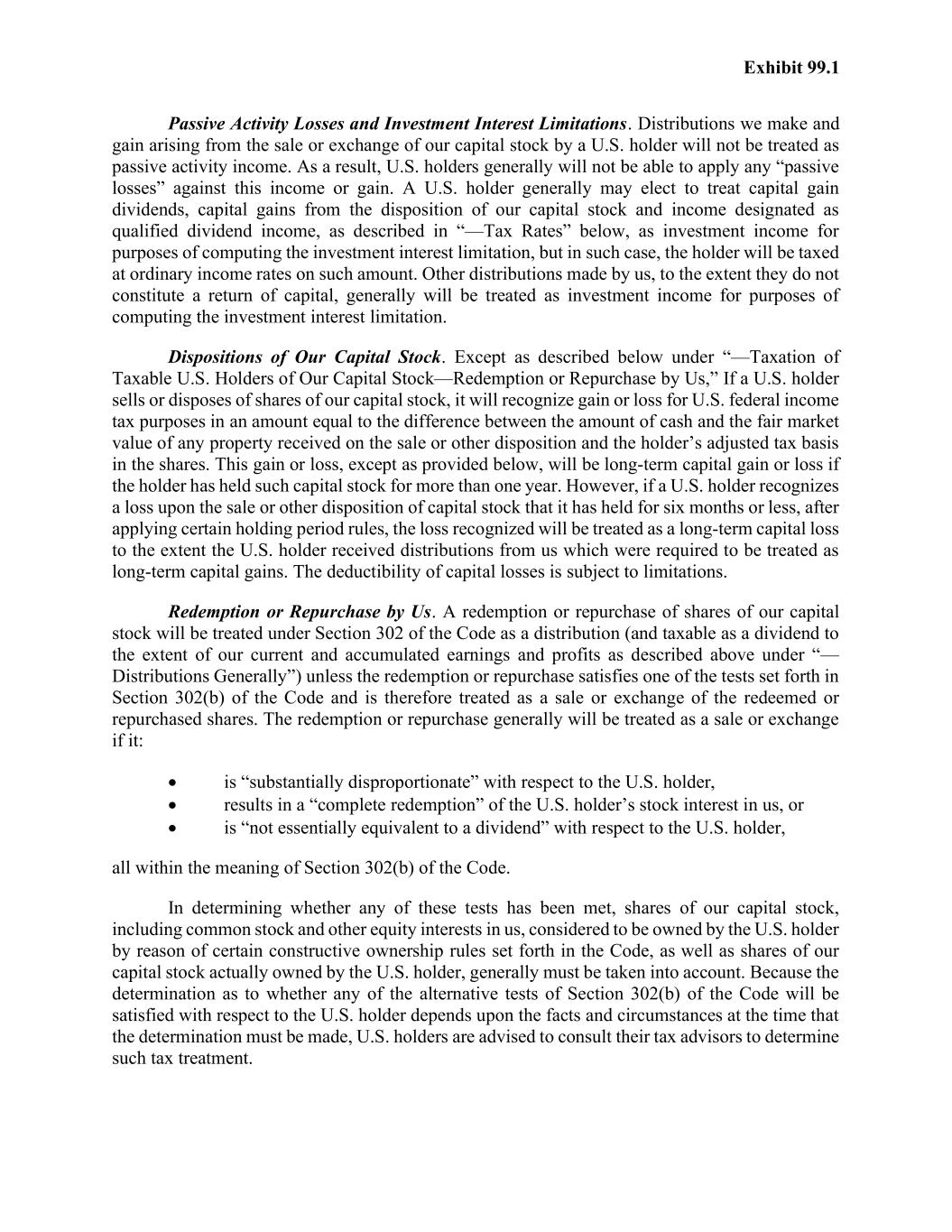 Exhibit 99.1 Passive Activity Losses and Investment Interest Limitations. Distributions we make and gain arising from the sale or exchange of our capital stock by a U.S. holder will not be treated as passive activity income. As a result, U.S. holders generally will not be able to apply any “passive losses” against this income or gain. A U.S. holder generally may elect to treat capital gain dividends, capital gains from the disposition of our capital stock and income designated as qualified dividend income, as described in “—Tax Rates” below, as investment income for purposes of computing the investment interest limitation, but in such case, the holder will be taxed at ordinary income rates on such amount. Other distributions made by us, to the extent they do not constitute a return of capital, generally will be treated as investment income for purposes of computing the investment interest limitation. Dispositions of Our Capital Stock. Except as described below under “—Taxation of Taxable U.S. Holders of Our Capital Stock—Redemption or Repurchase by Us,” If a U.S. holder sells or disposes of shares of our capital stock, it will recognize gain or loss for U.S. federal income tax purposes in an amount equal to the difference between the amount of cash and the fair market value of any property received on the sale or other disposition and the holder’s adjusted tax basis in the shares. This gain or loss, except as provided below, will be long-term capital gain or loss if the holder has held such capital stock for more than one year. However, if a U.S. holder recognizes a loss upon the sale or other disposition of capital stock that it has held for six months or less, after applying certain holding period rules, the loss recognized will be treated as a long-term capital loss to the extent the U.S. holder received distributions from us which were required to be treated as long-term capital gains. The deductibility of capital losses is subject to limitations. Redemption or Repurchase by Us. A redemption or repurchase of shares of our capital stock will be treated under Section 302 of the Code as a distribution (and taxable as a dividend to the extent of our current and accumulated earnings and profits as described above under “— Distributions Generally”) unless the redemption or repurchase satisfies one of the tests set forth in Section 302(b) of the Code and is therefore treated as a sale or exchange of the redeemed or repurchased shares. The redemption or repurchase generally will be treated as a sale or exchange if it: is “substantially disproportionate” with respect to the U.S. holder, results in a “complete redemption” of the U.S. holder’s stock interest in us, or is “not essentially equivalent to a dividend” with respect to the U.S. holder, all within the meaning of Section 302(b) of the Code. In determining whether any of these tests has been met, shares of our capital stock, including common stock and other equity interests in us, considered to be owned by the U.S. holder by reason of certain constructive ownership rules set forth in the Code, as well as shares of our capital stock actually owned by the U.S. holder, generally must be taken into account. Because the determination as to whether any of the alternative tests of Section 302(b) of the Code will be satisfied with respect to the U.S. holder depends upon the facts and circumstances at the time that the determination must be made, U.S. holders are advised to consult their tax advisors to determine such tax treatment.