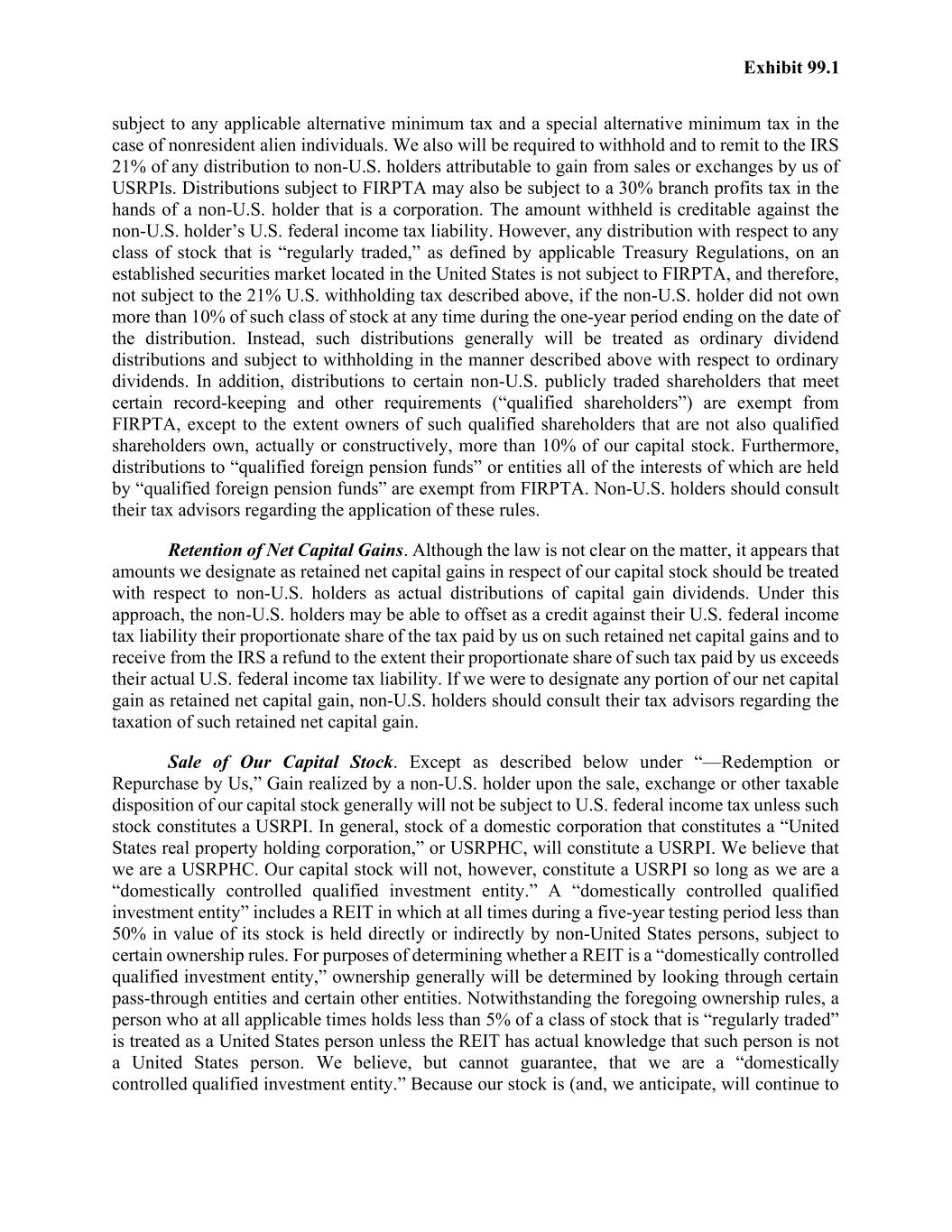 Exhibit 99.1 subject to any applicable alternative minimum tax and a special alternative minimum tax in the case of nonresident alien individuals. We also will be required to withhold and to remit to the IRS 21% of any distribution to non-U.S. holders attributable to gain from sales or exchanges by us of USRPIs. Distributions subject to FIRPTA may also be subject to a 30% branch profits tax in the hands of a non-U.S. holder that is a corporation. The amount withheld is creditable against the non-U.S. holder’s U.S. federal income tax liability. However, any distribution with respect to any class of stock that is “regularly traded,” as defined by applicable Treasury Regulations, on an established securities market located in the United States is not subject to FIRPTA, and therefore, not subject to the 21% U.S. withholding tax described above, if the non-U.S. holder did not own more than 10% of such class of stock at any time during the one-year period ending on the date of the distribution. Instead, such distributions generally will be treated as ordinary dividend distributions and subject to withholding in the manner described above with respect to ordinary dividends. In addition, distributions to certain non-U.S. publicly traded shareholders that meet certain record-keeping and other requirements (“qualified shareholders”) are exempt from FIRPTA, except to the extent owners of such qualified shareholders that are not also qualified shareholders own, actually or constructively, more than 10% of our capital stock. Furthermore, distributions to “qualified foreign pension funds” or entities all of the interests of which are held by “qualified foreign pension funds” are exempt from FIRPTA. Non-U.S. holders should consult their tax advisors regarding the application of these rules. Retention of Net Capital Gains. Although the law is not clear on the matter, it appears that amounts we designate as retained net capital gains in respect of our capital stock should be treated with respect to non-U.S. holders as actual distributions of capital gain dividends. Under this approach, the non-U.S. holders may be able to offset as a credit against their U.S. federal income tax liability their proportionate share of the tax paid by us on such retained net capital gains and to receive from the IRS a refund to the extent their proportionate share of such tax paid by us exceeds their actual U.S. federal income tax liability. If we were to designate any portion of our net capital gain as retained net capital gain, non-U.S. holders should consult their tax advisors regarding the taxation of such retained net capital gain. Sale of Our Capital Stock. Except as described below under “—Redemption or Repurchase by Us,” Gain realized by a non-U.S. holder upon the sale, exchange or other taxable disposition of our capital stock generally will not be subject to U.S. federal income tax unless such stock constitutes a USRPI. In general, stock of a domestic corporation that constitutes a “United States real property holding corporation,” or USRPHC, will constitute a USRPI. We believe that we are a USRPHC. Our capital stock will not, however, constitute a USRPI so long as we are a “domestically controlled qualified investment entity.” A “domestically controlled qualified investment entity” includes a REIT in which at all times during a five-year testing period less than 50% in value of its stock is held directly or indirectly by non-United States persons, subject to certain ownership rules. For purposes of determining whether a REIT is a “domestically controlled qualified investment entity,” ownership generally will be determined by looking through certain pass-through entities and certain other entities. Notwithstanding the foregoing ownership rules, a person who at all applicable times holds less than 5% of a class of stock that is “regularly traded” is treated as a United States person unless the REIT has actual knowledge that such person is not a United States person. We believe, but cannot guarantee, that we are a “domestically controlled qualified investment entity.” Because our stock is (and, we anticipate, will continue to