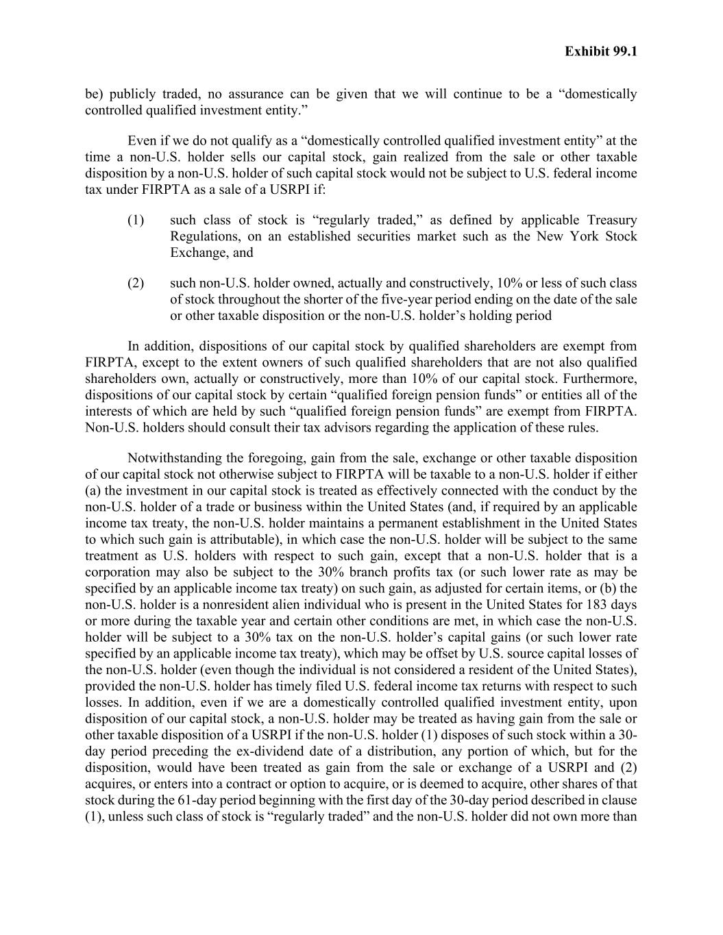 Exhibit 99.1 be) publicly traded, no assurance can be given that we will continue to be a “domestically controlled qualified investment entity.” Even if we do not qualify as a “domestically controlled qualified investment entity” at the time a non-U.S. holder sells our capital stock, gain realized from the sale or other taxable disposition by a non-U.S. holder of such capital stock would not be subject to U.S. federal income tax under FIRPTA as a sale of a USRPI if: (1) such class of stock is “regularly traded,” as defined by applicable Treasury Regulations, on an established securities market such as the New York Stock Exchange, and (2) such non-U.S. holder owned, actually and constructively, 10% or less of such class of stock throughout the shorter of the five-year period ending on the date of the sale or other taxable disposition or the non-U.S. holder’s holding period In addition, dispositions of our capital stock by qualified shareholders are exempt from FIRPTA, except to the extent owners of such qualified shareholders that are not also qualified shareholders own, actually or constructively, more than 10% of our capital stock. Furthermore, dispositions of our capital stock by certain “qualified foreign pension funds” or entities all of the interests of which are held by such “qualified foreign pension funds” are exempt from FIRPTA. Non-U.S. holders should consult their tax advisors regarding the application of these rules. Notwithstanding the foregoing, gain from the sale, exchange or other taxable disposition of our capital stock not otherwise subject to FIRPTA will be taxable to a non-U.S. holder if either (a) the investment in our capital stock is treated as effectively connected with the conduct by the non-U.S. holder of a trade or business within the United States (and, if required by an applicable income tax treaty, the non-U.S. holder maintains a permanent establishment in the United States to which such gain is attributable), in which case the non-U.S. holder will be subject to the same treatment as U.S. holders with respect to such gain, except that a non-U.S. holder that is a corporation may also be subject to the 30% branch profits tax (or such lower rate as may be specified by an applicable income tax treaty) on such gain, as adjusted for certain items, or (b) the non-U.S. holder is a nonresident alien individual who is present in the United States for 183 days or more during the taxable year and certain other conditions are met, in which case the non-U.S. holder will be subject to a 30% tax on the non-U.S. holder’s capital gains (or such lower rate specified by an applicable income tax treaty), which may be offset by U.S. source capital losses of the non-U.S. holder (even though the individual is not considered a resident of the United States), provided the non-U.S. holder has timely filed U.S. federal income tax returns with respect to such losses. In addition, even if we are a domestically controlled qualified investment entity, upon disposition of our capital stock, a non-U.S. holder may be treated as having gain from the sale or other taxable disposition of a USRPI if the non-U.S. holder (1) disposes of such stock within a 30- day period preceding the ex-dividend date of a distribution, any portion of which, but for the disposition, would have been treated as gain from the sale or exchange of a USRPI and (2) acquires, or enters into a contract or option to acquire, or is deemed to acquire, other shares of that stock during the 61-day period beginning with the first day of the 30-day period described in clause (1), unless such class of stock is “regularly traded” and the non-U.S. holder did not own more than