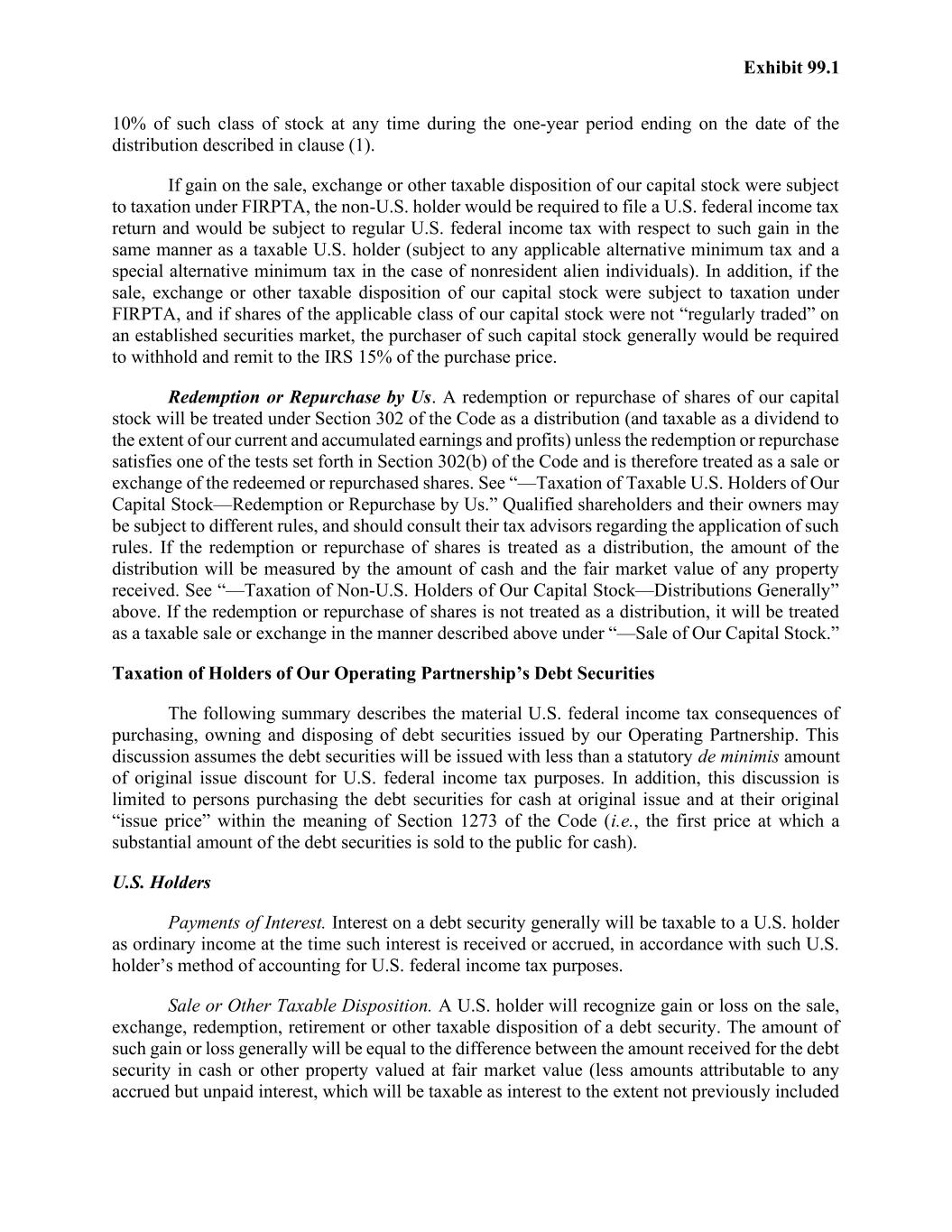 Exhibit 99.1 10% of such class of stock at any time during the one-year period ending on the date of the distribution described in clause (1). If gain on the sale, exchange or other taxable disposition of our capital stock were subject to taxation under FIRPTA, the non-U.S. holder would be required to file a U.S. federal income tax return and would be subject to regular U.S. federal income tax with respect to such gain in the same manner as a taxable U.S. holder (subject to any applicable alternative minimum tax and a special alternative minimum tax in the case of nonresident alien individuals). In addition, if the sale, exchange or other taxable disposition of our capital stock were subject to taxation under FIRPTA, and if shares of the applicable class of our capital stock were not “regularly traded” on an established securities market, the purchaser of such capital stock generally would be required to withhold and remit to the IRS 15% of the purchase price. Redemption or Repurchase by Us. A redemption or repurchase of shares of our capital stock will be treated under Section 302 of the Code as a distribution (and taxable as a dividend to the extent of our current and accumulated earnings and profits) unless the redemption or repurchase satisfies one of the tests set forth in Section 302(b) of the Code and is therefore treated as a sale or exchange of the redeemed or repurchased shares. See “—Taxation of Taxable U.S. Holders of Our Capital Stock—Redemption or Repurchase by Us.” Qualified shareholders and their owners may be subject to different rules, and should consult their tax advisors regarding the application of such rules. If the redemption or repurchase of shares is treated as a distribution, the amount of the distribution will be measured by the amount of cash and the fair market value of any property received. See “—Taxation of Non-U.S. Holders of Our Capital Stock—Distributions Generally” above. If the redemption or repurchase of shares is not treated as a distribution, it will be treated as a taxable sale or exchange in the manner described above under “—Sale of Our Capital Stock.” Taxation of Holders of Our Operating Partnership’s Debt Securities The following summary describes the material U.S. federal income tax consequences of purchasing, owning and disposing of debt securities issued by our Operating Partnership. This discussion assumes the debt securities will be issued with less than a statutory de minimis amount of original issue discount for U.S. federal income tax purposes. In addition, this discussion is limited to persons purchasing the debt securities for cash at original issue and at their original “issue price” within the meaning of Section 1273 of the Code (i.e., the first price at which a substantial amount of the debt securities is sold to the public for cash). U.S. Holders Payments of Interest. Interest on a debt security generally will be taxable to a U.S. holder as ordinary income at the time such interest is received or accrued, in accordance with such U.S. holder’s method of accounting for U.S. federal income tax purposes. Sale or Other Taxable Disposition. A U.S. holder will recognize gain or loss on the sale, exchange, redemption, retirement or other taxable disposition of a debt security. The amount of such gain or loss generally will be equal to the difference between the amount received for the debt security in cash or other property valued at fair market value (less amounts attributable to any accrued but unpaid interest, which will be taxable as interest to the extent not previously included
