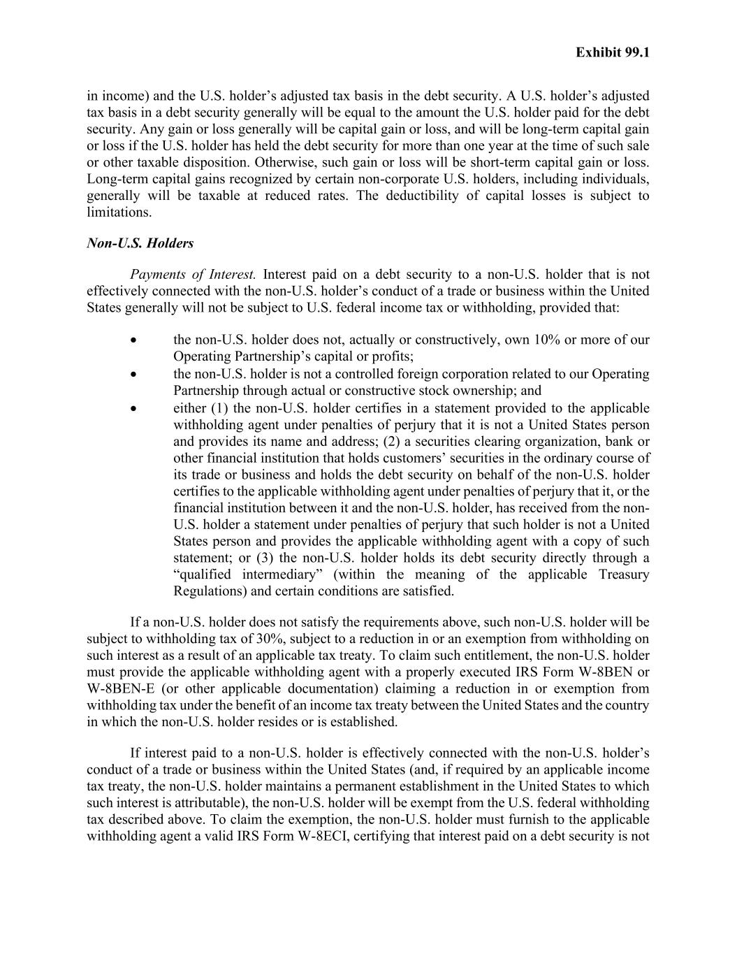 Exhibit 99.1 in income) and the U.S. holder’s adjusted tax basis in the debt security. A U.S. holder’s adjusted tax basis in a debt security generally will be equal to the amount the U.S. holder paid for the debt security. Any gain or loss generally will be capital gain or loss, and will be long-term capital gain or loss if the U.S. holder has held the debt security for more than one year at the time of such sale or other taxable disposition. Otherwise, such gain or loss will be short-term capital gain or loss. Long-term capital gains recognized by certain non-corporate U.S. holders, including individuals, generally will be taxable at reduced rates. The deductibility of capital losses is subject to limitations. Non-U.S. Holders Payments of Interest. Interest paid on a debt security to a non-U.S. holder that is not effectively connected with the non-U.S. holder’s conduct of a trade or business within the United States generally will not be subject to U.S. federal income tax or withholding, provided that: the non-U.S. holder does not, actually or constructively, own 10% or more of our Operating Partnership’s capital or profits; the non-U.S. holder is not a controlled foreign corporation related to our Operating Partnership through actual or constructive stock ownership; and either (1) the non-U.S. holder certifies in a statement provided to the applicable withholding agent under penalties of perjury that it is not a United States person and provides its name and address; (2) a securities clearing organization, bank or other financial institution that holds customers’ securities in the ordinary course of its trade or business and holds the debt security on behalf of the non-U.S. holder certifies to the applicable withholding agent under penalties of perjury that it, or the financial institution between it and the non-U.S. holder, has received from the non- U.S. holder a statement under penalties of perjury that such holder is not a United States person and provides the applicable withholding agent with a copy of such statement; or (3) the non-U.S. holder holds its debt security directly through a “qualified intermediary” (within the meaning of the applicable Treasury Regulations) and certain conditions are satisfied. If a non-U.S. holder does not satisfy the requirements above, such non-U.S. holder will be subject to withholding tax of 30%, subject to a reduction in or an exemption from withholding on such interest as a result of an applicable tax treaty. To claim such entitlement, the non-U.S. holder must provide the applicable withholding agent with a properly executed IRS Form W-8BEN or W-8BEN-E (or other applicable documentation) claiming a reduction in or exemption from withholding tax under the benefit of an income tax treaty between the United States and the country in which the non-U.S. holder resides or is established. If interest paid to a non-U.S. holder is effectively connected with the non-U.S. holder’s conduct of a trade or business within the United States (and, if required by an applicable income tax treaty, the non-U.S. holder maintains a permanent establishment in the United States to which such interest is attributable), the non-U.S. holder will be exempt from the U.S. federal withholding tax described above. To claim the exemption, the non-U.S. holder must furnish to the applicable withholding agent a valid IRS Form W-8ECI, certifying that interest paid on a debt security is not