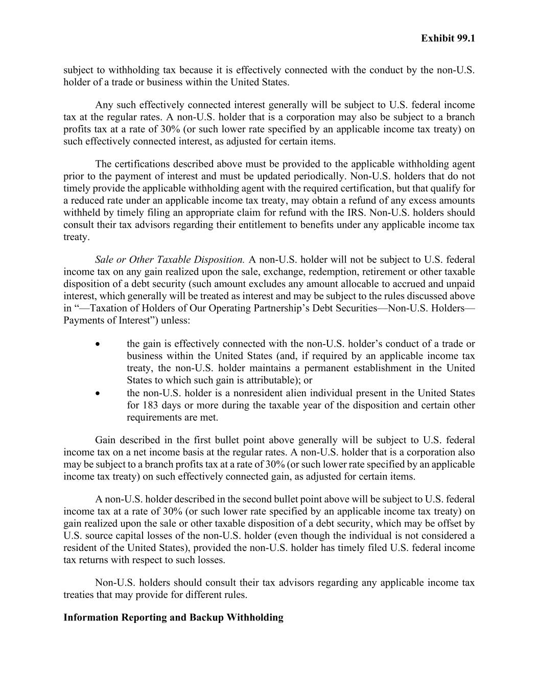 Exhibit 99.1 subject to withholding tax because it is effectively connected with the conduct by the non-U.S. holder of a trade or business within the United States. Any such effectively connected interest generally will be subject to U.S. federal income tax at the regular rates. A non-U.S. holder that is a corporation may also be subject to a branch profits tax at a rate of 30% (or such lower rate specified by an applicable income tax treaty) on such effectively connected interest, as adjusted for certain items. The certifications described above must be provided to the applicable withholding agent prior to the payment of interest and must be updated periodically. Non-U.S. holders that do not timely provide the applicable withholding agent with the required certification, but that qualify for a reduced rate under an applicable income tax treaty, may obtain a refund of any excess amounts withheld by timely filing an appropriate claim for refund with the IRS. Non-U.S. holders should consult their tax advisors regarding their entitlement to benefits under any applicable income tax treaty. Sale or Other Taxable Disposition. A non-U.S. holder will not be subject to U.S. federal income tax on any gain realized upon the sale, exchange, redemption, retirement or other taxable disposition of a debt security (such amount excludes any amount allocable to accrued and unpaid interest, which generally will be treated as interest and may be subject to the rules discussed above in “—Taxation of Holders of Our Operating Partnership’s Debt Securities—Non-U.S. Holders— Payments of Interest”) unless: the gain is effectively connected with the non-U.S. holder’s conduct of a trade or business within the United States (and, if required by an applicable income tax treaty, the non-U.S. holder maintains a permanent establishment in the United States to which such gain is attributable); or the non-U.S. holder is a nonresident alien individual present in the United States for 183 days or more during the taxable year of the disposition and certain other requirements are met. Gain described in the first bullet point above generally will be subject to U.S. federal income tax on a net income basis at the regular rates. A non-U.S. holder that is a corporation also may be subject to a branch profits tax at a rate of 30% (or such lower rate specified by an applicable income tax treaty) on such effectively connected gain, as adjusted for certain items. A non-U.S. holder described in the second bullet point above will be subject to U.S. federal income tax at a rate of 30% (or such lower rate specified by an applicable income tax treaty) on gain realized upon the sale or other taxable disposition of a debt security, which may be offset by U.S. source capital losses of the non-U.S. holder (even though the individual is not considered a resident of the United States), provided the non-U.S. holder has timely filed U.S. federal income tax returns with respect to such losses. Non-U.S. holders should consult their tax advisors regarding any applicable income tax treaties that may provide for different rules. Information Reporting and Backup Withholding