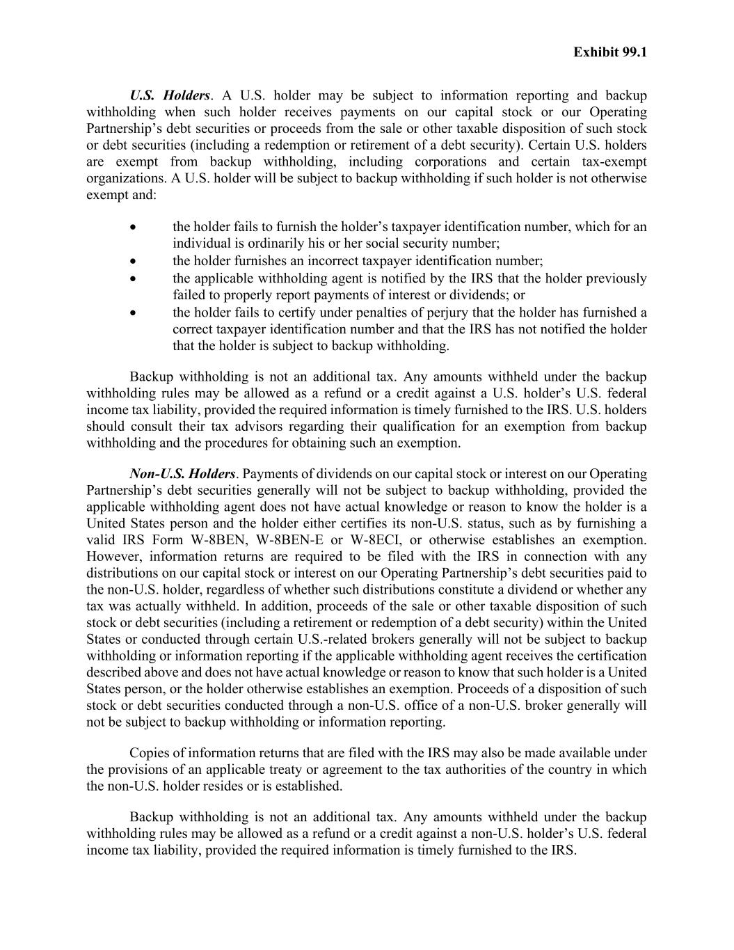 Exhibit 99.1 U.S. Holders. A U.S. holder may be subject to information reporting and backup withholding when such holder receives payments on our capital stock or our Operating Partnership’s debt securities or proceeds from the sale or other taxable disposition of such stock or debt securities (including a redemption or retirement of a debt security). Certain U.S. holders are exempt from backup withholding, including corporations and certain tax-exempt organizations. A U.S. holder will be subject to backup withholding if such holder is not otherwise exempt and: the holder fails to furnish the holder’s taxpayer identification number, which for an individual is ordinarily his or her social security number; the holder furnishes an incorrect taxpayer identification number; the applicable withholding agent is notified by the IRS that the holder previously failed to properly report payments of interest or dividends; or the holder fails to certify under penalties of perjury that the holder has furnished a correct taxpayer identification number and that the IRS has not notified the holder that the holder is subject to backup withholding. Backup withholding is not an additional tax. Any amounts withheld under the backup withholding rules may be allowed as a refund or a credit against a U.S. holder’s U.S. federal income tax liability, provided the required information is timely furnished to the IRS. U.S. holders should consult their tax advisors regarding their qualification for an exemption from backup withholding and the procedures for obtaining such an exemption. Non-U.S. Holders. Payments of dividends on our capital stock or interest on our Operating Partnership’s debt securities generally will not be subject to backup withholding, provided the applicable withholding agent does not have actual knowledge or reason to know the holder is a United States person and the holder either certifies its non-U.S. status, such as by furnishing a valid IRS Form W-8BEN, W-8BEN-E or W-8ECI, or otherwise establishes an exemption. However, information returns are required to be filed with the IRS in connection with any distributions on our capital stock or interest on our Operating Partnership’s debt securities paid to the non-U.S. holder, regardless of whether such distributions constitute a dividend or whether any tax was actually withheld. In addition, proceeds of the sale or other taxable disposition of such stock or debt securities (including a retirement or redemption of a debt security) within the United States or conducted through certain U.S.-related brokers generally will not be subject to backup withholding or information reporting if the applicable withholding agent receives the certification described above and does not have actual knowledge or reason to know that such holder is a United States person, or the holder otherwise establishes an exemption. Proceeds of a disposition of such stock or debt securities conducted through a non-U.S. office of a non-U.S. broker generally will not be subject to backup withholding or information reporting. Copies of information returns that are filed with the IRS may also be made available under the provisions of an applicable treaty or agreement to the tax authorities of the country in which the non-U.S. holder resides or is established. Backup withholding is not an additional tax. Any amounts withheld under the backup withholding rules may be allowed as a refund or a credit against a non-U.S. holder’s U.S. federal income tax liability, provided the required information is timely furnished to the IRS.