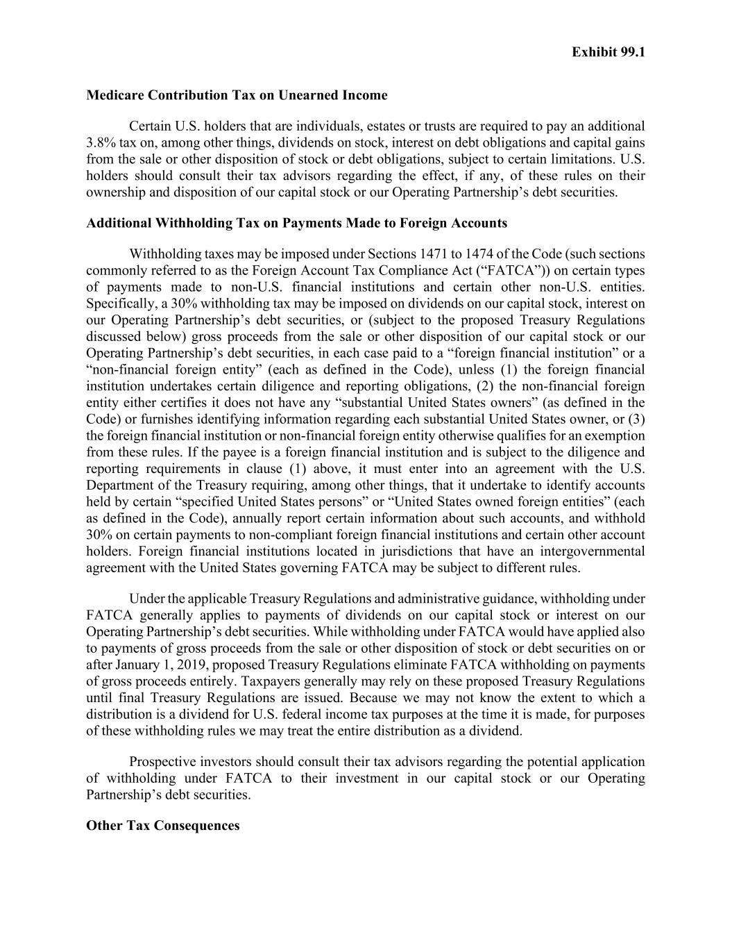 Exhibit 99.1 Medicare Contribution Tax on Unearned Income Certain U.S. holders that are individuals, estates or trusts are required to pay an additional 3.8% tax on, among other things, dividends on stock, interest on debt obligations and capital gains from the sale or other disposition of stock or debt obligations, subject to certain limitations. U.S. holders should consult their tax advisors regarding the effect, if any, of these rules on their ownership and disposition of our capital stock or our Operating Partnership’s debt securities. Additional Withholding Tax on Payments Made to Foreign Accounts Withholding taxes may be imposed under Sections 1471 to 1474 of the Code (such sections commonly referred to as the Foreign Account Tax Compliance Act (“FATCA”)) on certain types of payments made to non-U.S. financial institutions and certain other non-U.S. entities. Specifically, a 30% withholding tax may be imposed on dividends on our capital stock, interest on our Operating Partnership’s debt securities, or (subject to the proposed Treasury Regulations discussed below) gross proceeds from the sale or other disposition of our capital stock or our Operating Partnership’s debt securities, in each case paid to a “foreign financial institution” or a “non-financial foreign entity” (each as defined in the Code), unless (1) the foreign financial institution undertakes certain diligence and reporting obligations, (2) the non-financial foreign entity either certifies it does not have any “substantial United States owners” (as defined in the Code) or furnishes identifying information regarding each substantial United States owner, or (3) the foreign financial institution or non-financial foreign entity otherwise qualifies for an exemption from these rules. If the payee is a foreign financial institution and is subject to the diligence and reporting requirements in clause (1) above, it must enter into an agreement with the U.S. Department of the Treasury requiring, among other things, that it undertake to identify accounts held by certain “specified United States persons” or “United States owned foreign entities” (each as defined in the Code), annually report certain information about such accounts, and withhold 30% on certain payments to non-compliant foreign financial institutions and certain other account holders. Foreign financial institutions located in jurisdictions that have an intergovernmental agreement with the United States governing FATCA may be subject to different rules. Under the applicable Treasury Regulations and administrative guidance, withholding under FATCA generally applies to payments of dividends on our capital stock or interest on our Operating Partnership’s debt securities. While withholding under FATCA would have applied also to payments of gross proceeds from the sale or other disposition of stock or debt securities on or after January 1, 2019, proposed Treasury Regulations eliminate FATCA withholding on payments of gross proceeds entirely. Taxpayers generally may rely on these proposed Treasury Regulations until final Treasury Regulations are issued. Because we may not know the extent to which a distribution is a dividend for U.S. federal income tax purposes at the time it is made, for purposes of these withholding rules we may treat the entire distribution as a dividend. Prospective investors should consult their tax advisors regarding the potential application of withholding under FATCA to their investment in our capital stock or our Operating Partnership’s debt securities. Other Tax Consequences