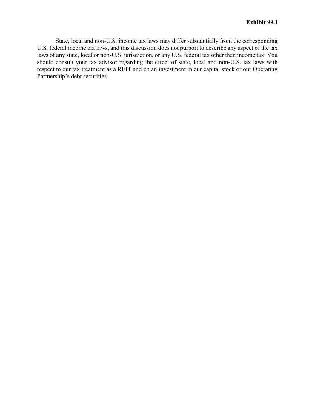 Exhibit 99.1 State, local and non-U.S. income tax laws may differ substantially from the corresponding U.S. federal income tax laws, and this discussion does not purport to describe any aspect of the tax laws of any state, local or non-U.S. jurisdiction, or any U.S. federal tax other than income tax. You should consult your tax advisor regarding the effect of state, local and non-U.S. tax laws with respect to our tax treatment as a REIT and on an investment in our capital stock or our Operating Partnership’s debt securities.